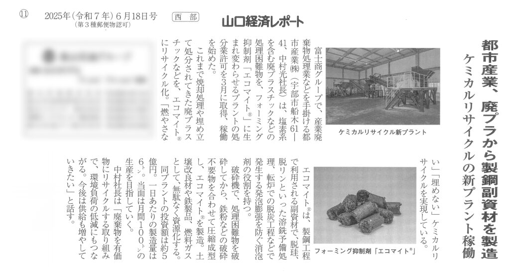 TOP お知らせ グループ各社 都市産業株式会社 山口経済レポート(6/18号)に掲載されました。 News お知らせ 2025.06.23グループ各社都市産業株式会社 山口経済レポート(6/18号)に掲載されました。 都市産業株式会社で、この度廃プラから製鋼副資材を製造する新プラントの稼働を開始したことが、2025年(令和7年)6月18日号の「山口経済レポート」に掲載されました。 一覧に戻る