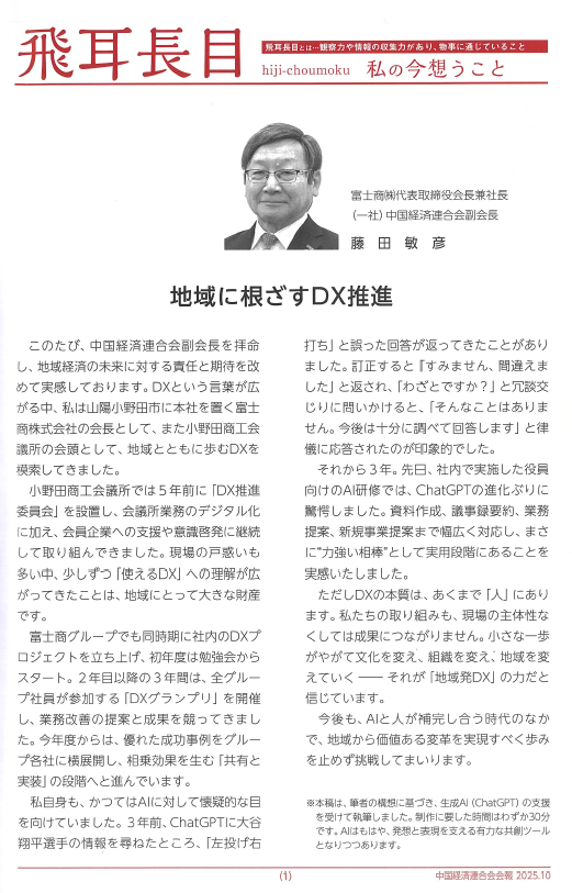 News お知らせ 2025年10月03日 中国経済連合会会報10月号「飛耳長目ページ」に掲載されました。 2025年(令和7年)10月号の中国経済連合会 会報(No.585)、「飛耳長目」のページに「地域に根ざしたDX推進」に関する記事が掲載されました。 TOP お知らせ