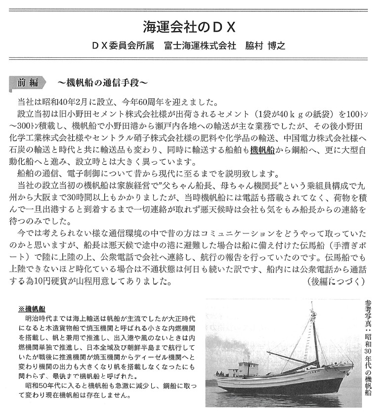 News お知らせ 2025年10月10日 富士海運株式会社 小野田商工会議所/DX推進委員会としてDXの記事(前編)が掲載されました。 富士海運株式会社は、2025年(令和7年)10月1日発行の商工おのだ(No.868)内、DX推進委員会 特別寄稿ページへDXに関する記事が掲載されました。 TOP お知らせ