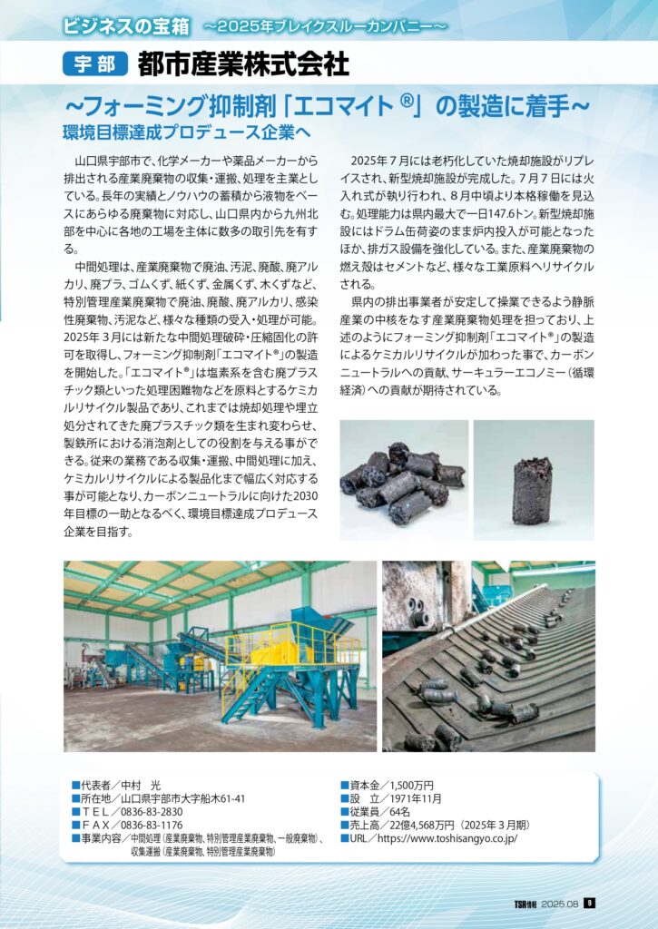 都市産業株式会社は、2025年(令和7年)8月21日の株式会社 東京商工リサーチのTSR情報特集号 さんよう版に~フォーミング抑制剤「エコマイト®」~に関する記事が掲載されました。